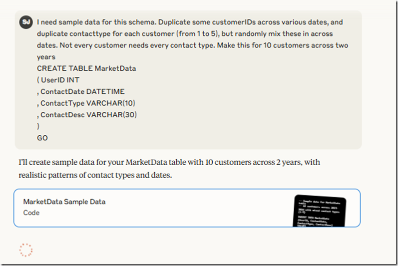 Once I had the code, I jumped over to Claude to give this a try. You can see the prompt below, but it was this: I need sample data for this schema. Duplicate some customerIDs across various dates, and duplicate contacttype for each customer (from 1 to 5), but randomly mix these in across dates. Not every customer needs every contact type. Make this for 10 customers across two years