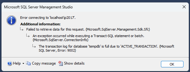 Have you ever received the dreaded error from SQL Server that the TempDB log file is full? Only to open SSMS and be greeted with a message that prevents you from connecting.