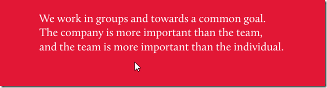 This value is something that I still hear today: our best work is done in teams. On the facing page, there is a short description of what this means.