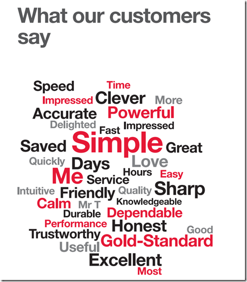 Ingeniously Simple was a tagline that our founders aimed for with our first products. I still remember this and challenge developers to work towards this. However, I love these words being things that stand out: calm, dependable, Gold-Standard, Excellent, Trustworthy, even Love.