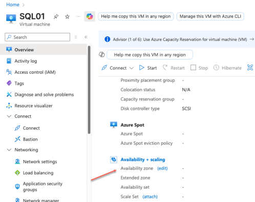 In this exmaple, I have a SQL Server Azure virtual machine in my tenant called SQL01. As shown in the screenshot, the Availability + scaling section indicates that the VM is not currently in an availability zone.