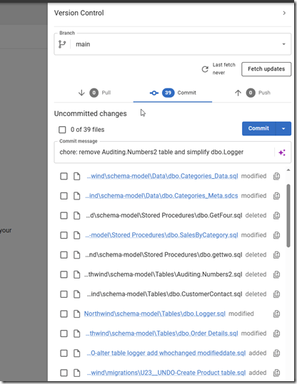 When I go to the VCS tab in Flyway Desktop (FWD), I see all my changes listed. In this case, I’ve been demoing and testing a lot of things that I haven’t committed. Bad practice, and I’m a little upset with myself for not keeping my repo clean.