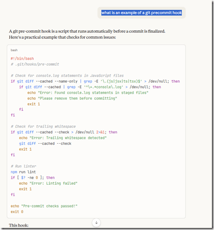 At the top there is a comment about the hook, and since I’d done this a few years ago, I thought I know what to do, but I asked. I mean, why not ask the AI for more help? I liked that it noted not only do I need to add this to my .git folder, but I need to track this if I want to share it. That’s important. I do want other team member, or in this case, me on another machine, to have this hook.