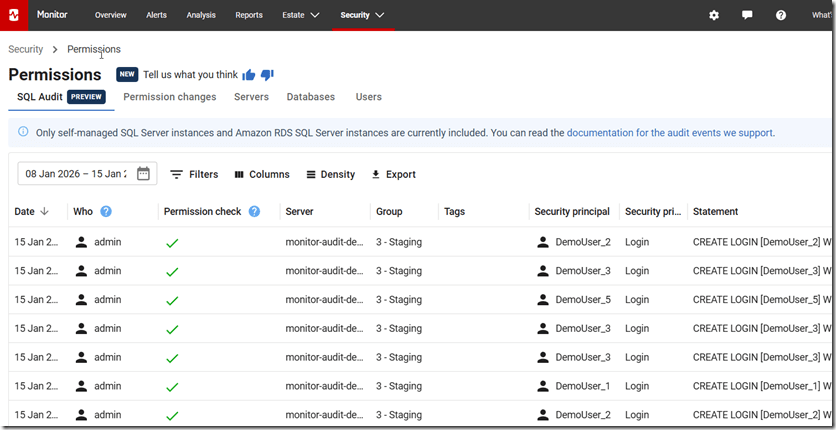 There is a new tab in Redgate Monitor Enterprise Permissions page that contains this data. This is listed as “SQL Audit” and you can see this below.