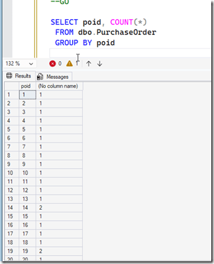 I’ll run this query. Notice I use a GROUP BY on the poid to list these together with a count. In the image, we see some counts that are greater than 1, which indicates a duplicate. We are grouping, or putting all the rows with the same value together.