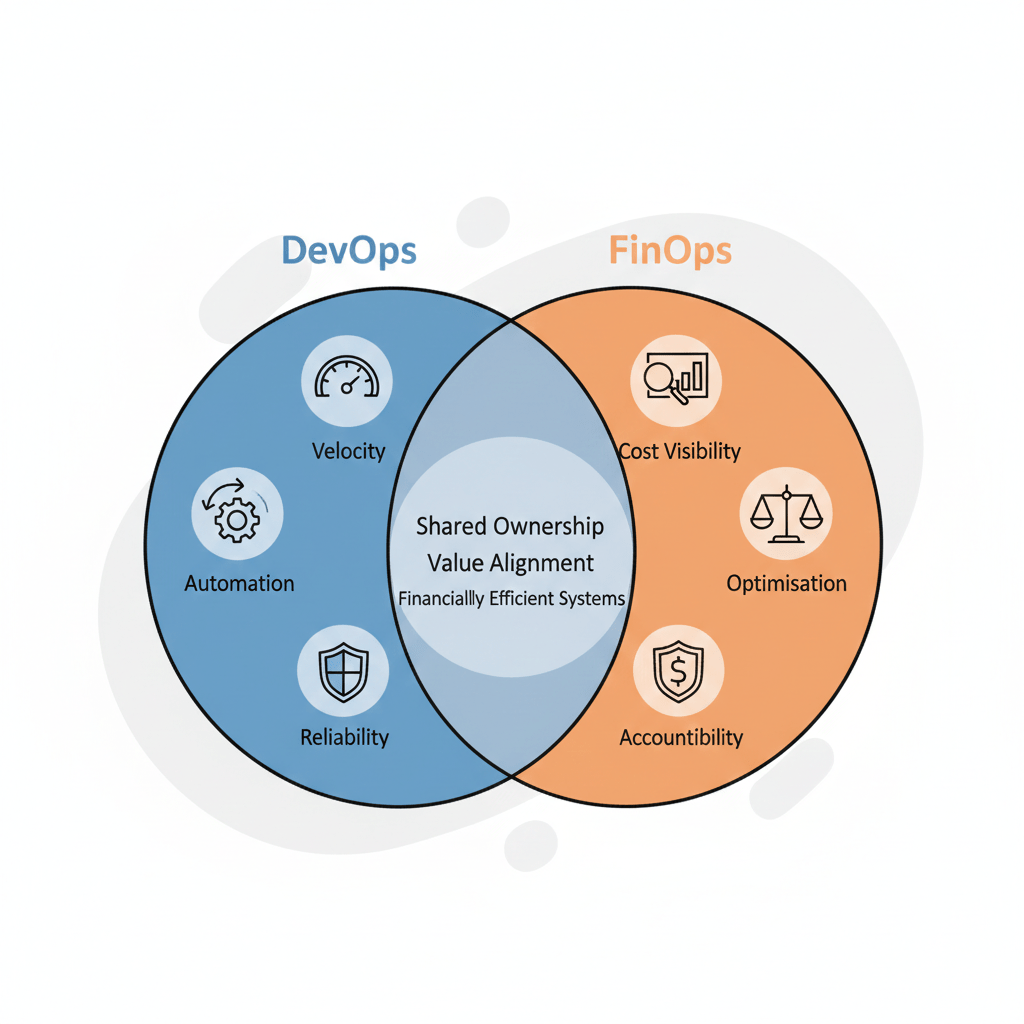 DevOps removes software inefficiencies, FinOps removes financial waste. DevOps focuses on velocity, reliability, and smooth delivery through automation and collaboration. FinOps adds another layer of discipline, and it does not slow teams down. It ensures that hard-earned velocity doesn’t turn into uncontrolled spending. Acceleration without optimisation increases risk, and optimisation without acceleration limits innovation.